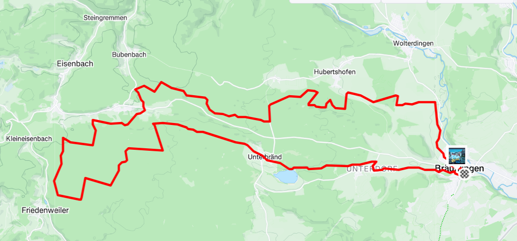 Wir umlaufen die kleine Ortschaft Oberbränd südlich und nähern uns der Halbzeit, die wir nach 2:23 Stunden erreichen. Auch hier erfolgt eine elektronische Zeitnahme. Zahlreiche weitere, optisch unspektakuläre km führen durch den Forst, die durch meine Gespräche mit Georg fast unbemerkt vergehen. Die Sonne lacht dazu seit geraumer Zeit und gegen das Verlaufen schützen zahlreiche Flatterbänder und Bodenmarkierungen. Nach gut 34 km durchqueren wir das genau so wie Oberbränd kleine Unterbränd, das zunächst mit einer netten, steinernen Kapelle glänzt und dann durch eine Partyzone. Partyzone? Rechts und links des Wegs sorgen viele Schilder mit lockeren, für mich teilweise tatsächlich neuen Sprüchen (z.B. „Eat Pasta, run fasta“) für Amusement, als deren Höhepunkt ein privater VP überrascht. „Likörchen oder Wein?“ heißt es am Gabentisch, was erst mich, dann Georg zu Vollbremsungen verleitet. „Ist das Euer Ernst?“ „Klar, das Zeug muß weg!“ Da lassen wir uns doch nicht zweimal bitten und langen beherzt zu. Alte Hasen sind über alles erhaben und lassen sich das Likörchen (es gibt sogar eine Auswahl!) schmecken. Als Resultat schweben wir wie auf Wolken weiter, denn seit km 22 geht es kontinuierlich bergab. Knappe fünfhundert Höhenmeter wird Strava am Ende attestieren.