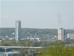 Wir überqueren den Rhein über die Kennedy-Brücke, die mittlere der 3 Bonner Brücken, die nach jahrelanger Renovierung endlich wieder frei nutzbar ist. Sie hat, das ist bisher wohl einmalig, eine durchgehende Photovoltaikanlage erhalten. Wie immer sind alle froh, als die Bebauung dünner wird und sich Möglichkeiten zur unauffälligen Erleichterung ergeben. Über die Beueler Rheinauen – frischgebackene Abiturienten machen lautstark Party und stehen Spalier - passieren wir zunächst das Hauptquartier der Telekomiker (T-Online, zugleich Startbereich des Rheinsteig-Extremlaufs über 34 km und 1.200 Höhenmeter) und kommen durch das sich von Jahr zu Jahr weiterentwickelnde Neubaugebiet von Küdinghoven. Die Vegetation in den Gärten hat in den letzten Jahren mächtige Fortschritte gemacht. Und nach der Überquerung von Straßenbahnlinie und A 59 stehen wir schon bald am Eingang des Waldgebiets „Ennert“ als Einstieg ins Siebengebirge und entern diesen über eine ganze Reihe Stufen. Hier gibt’s beim Rheinsteig-Extremlauf immer den ersten Stau.