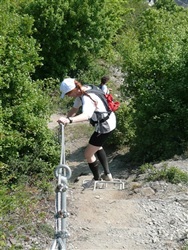 Schleife für Schleife schrauben wir uns wieder nach oben und dort angekommen, ist Trechtingshausen mit seiner weitläufigen Burganlage Reichenstein eine Augenweide. Ob es irgendwo anders noch eine solche Burgendichte wie hier am Rhein gibt? Auf felsigem Pfad gibt es seit neuestem endlich eine Seilsicherung, die den teilweise kriminell nach unten gehenden Trail sichert. Klettern ist phasenweise angesagt. Als besondere Spontaneinlage wird nach ca. 42 km an der virtuellen Marathonmarke Spalier gestanden und die Ultranovizen werden geehrt.