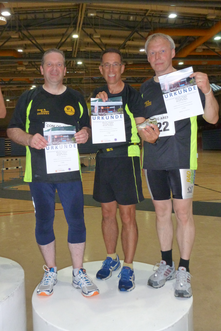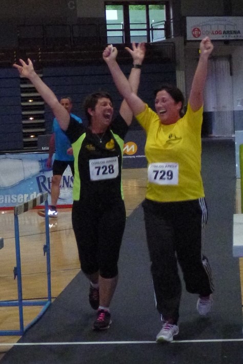 Toller Erfolg des Waldbreitbacher Laufkurses! Nichts als glückliche Gesichter gab es beim krönenden Abschluß des ersten Laufkurses des VfL Waldbreitbach. Neun Wochen lang hatten sich Laufanfänger sowie Wiedereinsteiger aus Wald- und Niederbreitbach, Roßbach, Hausen, Neschen, Bad Hönningen und Leubsdorf im Alter zwischen 10 und 65 Jahren auf diesen Tag vorbereitet. Zunächst ungewohnt war es für viele, diszipliniert dreimal wöchentlich, davon zweimal unter fachkundiger Anleitung, zu trainieren. Immer 30 Minuten lang pro Trainingseinheit waren die Anfänger gefordert, 60 die Wiedereinsteiger. Stand für die Anfänger zunächst ein Wechsel zwischen zwei Minuten Laufen und einer Minute Gehen auf dem Plan, der wöchentlich gesteigert wurde, setzten die Wiedereinsteiger bei 30 Minuten Laufen ein. In der letzten Woche waren die Anfänger in der Lage, 30 Minuten am Stück zu laufen, die Wiedereinsteiger 60. Die Bewährungsprobe, quasi als Gesellenstück, fand in Koblenz beim Volkslauf Rund um die CONLOG-Arena (Sporthalle Oberwerth) statt. 5,2 km bzw. 10 km lauteten die Herausforderungen. Leider hatten einige wenige Kursteilnehmer aus orthopädischen Gründen im Laufe des Kurses aufhören müssen und einige Erfolgreiche waren am Lauftag arbeits- bzw. urlaubsbedingt verhindert. Trotzdem war der Laufkurs des VfL Waldbreitbach mit 28 Teilnehmern vor Ort die größte, vor allem aber auch die lauteste Gruppe, von denen alle mit strahlenden Gesichtern das Ziel in der Sporthalle erreichten. Dieser Zieleinlauf, einmalig in Rheinland-Pfalz, schuf eine ganz besondere Atmosphäre auf den letzten Metern, die alle sichtlich genossen. Insbesondere jedoch die 10 km-Läufer, die das komplette Rennen im strömenden Regen zurücklegen mußten, zu keinem Zeitpunkt aber ihre gute Laune verloren. Der gleichermaßen grandiose wie überraschende Höhepunkt war der Gewinn aller drei Plätze in der Mannschaftswertung der Frauen sowie des zweiten Platzes bei den Männern im 5,2 km-Lauf. Dies war Grund genug, diesen Erfolg ausgiebig zu feiern.