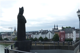 Um das Gebäude der heutigen Struktur- und Dienstleistungsdirektion Nord (vulgo Bezirksregierung) und den Gerichtsgebäuden erreichen wir den Deinhardplatz, der mit einem Ensemble mehrerer historischer Gebäude inkl. eines Obelisken zweifellos eine der Koblenzer Schokoladenseiten darstellt. Der Name kommt nicht von ungefähr: Hier nahm die Koblenzer Wein- und Sektherstellung ihren Anfang. Über die breite Pfuhlgasse (die tatsächlich ursprünglich schmale Gasse hatte man nach dem Krieg stark verbreitert) biegen wir in die zentrale Altstadt ein. Seit vielen Jahren ist der Entenpfuhl als Fußgängerzone beliebte Einkaufsstraße. Die Firmungsstraße führt an meinem Lieblingsplatz, dem Jesuitenplatz, mit ehem. Kolleg, Kirche und weiteren Glanzlichtern vorbei über den Görresplatz mit Historiensäule zum Rhein. Zahlreiche Cafés haben geöffnet, die draußen Sitzenden spenden manchmal sogar Beifall.