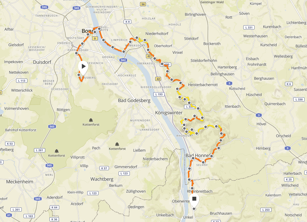 Die Aktualisierung unserer Raum-/Zeit-Berechnung fällt zuungunsten der weiteren Verfolgung des Rheinsteigs aus, daher steuern wir auf kürzestem Wege Bad Honnef an und sind begeistert über einen tollen, 2 km langen Singletrail entlang eines Baches in die Stadt. Und selbst dort zwischen Wohnbebauung und Gewerbegebieten finden sich zahlreiche schöne Pfade, wenn man sich, wie Iris und Peter, bestens auskennt.