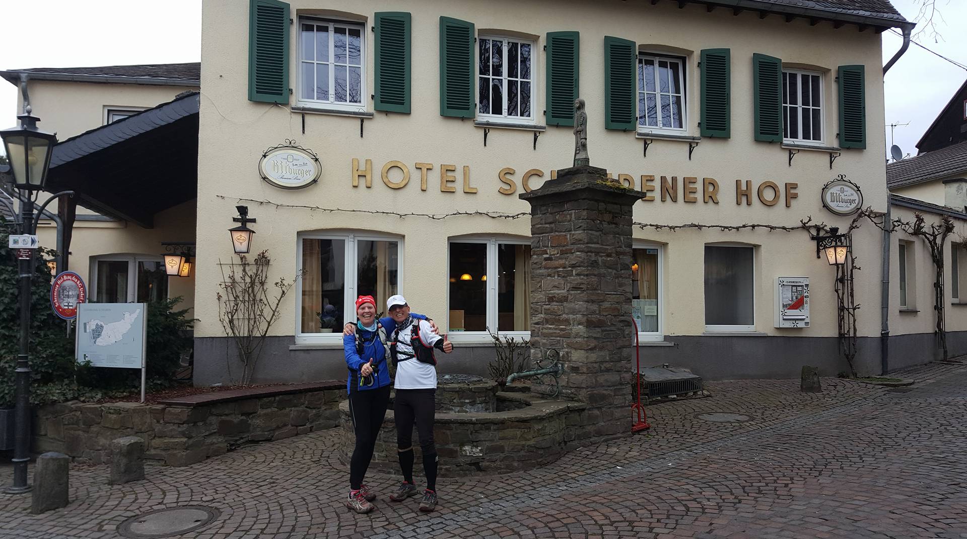 So sind wir nach sechseinhalb Stunden Bewegungszeit bereits nach 45 km und 1.200 Höhenmetern am Ziel vorm Scheurener Hof. Die ohne uns verwaiste Truppe wird zwei Stunden später mit sieben km und 400 Höhenmetern mehr auf dem Tacho eintreffen. Peter schießt noch ein Beweisfoto von Iris und mir, dann ist das Thema Rheinsteig-Erlebnislauf 2018 für mich leider schon Geschichte.