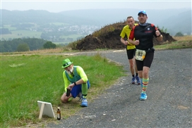 Schon wenige Meter nach dem Start trifft mich fast der Schlag, denn es geht mächtig bergab. Wenn das symptomatisch fürs Streckenprofil sein sollte, steht uns heute ein netter Tanz bevor. Gerechnet hatte ich mit einem leicht welligen Profil, denn es gibt weit weniger schroffe Anstiege als bei uns im rheinischen Westerwald. Aber sehr schön ist das weitläufige Nistertal von oben anzusehen, keine Frage. Die Nister ist mit unserer Wied gut zu vergleichen, wenn auch nicht so lang: 64 km schlängelt sie sich von Willingen an der Fuchskaute (höchster Berg des Westerwalds) und mündet in die Sieg. Wir könnten es uns schon nach gut einem km munden lassen, aber den ersten VP, acht gibt es insgesamt (manche werden doppelt angelaufen), lassen wir noch im wahrsten Sinne des Wortes links liegen. Erst mal was schaffen!