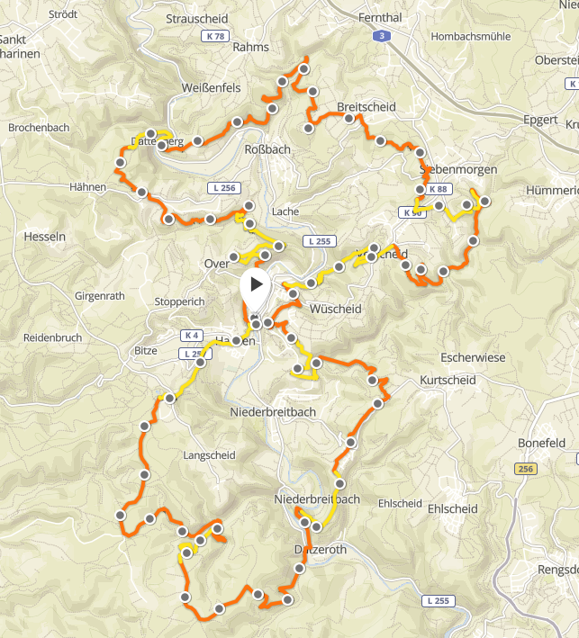 |  | Hollig ist unser nächstes Zwischenziel, durch den Wald zieht sich die Gruppe doch stärker als gewollt auseinander, ein paar schwächeln schon merklich. Nun, vorgewarnt hatten wir, jeder sollte aktuell in der Lage sein, einen flachen Marathon im Sechserschnitt laufen zu können. Gruppenlauf, 65 km, das packen wir schon, dachten alle, aber einigen wenigen werden die vielen Höhenmeter doch vorzeitig zum Verhängnis. Am Ortsausgang von Hochscheid sind wir wieder im Wald und nach 41,5 km am dritten VP beim Sportplatz Nassen angelangt. Zum zweiten Mal bereits sind die gekochten Kartoffeln mit Salz der Renner, auch das frische Brot mit Käse geht hervorragend. Neben den vielen übrigen Sachen. Negative Kalorienbilanz? Na ja...