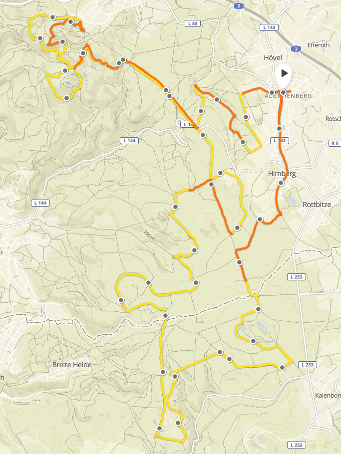 |  | In den langen Stellweg eingebogen, bekommen wir noch einmal das ganze Drama des Waldsterbens und Abholzens vor Augen geführt, ein wahres Trauerspiel. Dann sind wir in Himberg und uns wird schlecht. Weder vor Anstrengung noch vor Hunger, sondern vor Entsetzen, denn eines der ersten Häuser ist mit Weihnachts“schmuck“ vollkommen überladen. Wenn man schlechten Geschmack definieren müßte, würde ich diese Adresse angeben. Nix wie weg. Über die Straßenkreuzung in Aegidienberg hinweg sind alle 780 Höhenmeter abgearbeitet und nur noch zwei km abzustrampeln. Zwei km, auf denen ich im Jahre des Heils 2002 bei meinem ersten Marathon (heute ist es Nr. 161) fast gestorben bin. Endlose zwei km, die ich heute mit meiner Begleitung mühelos entlanghoppele. Aber auch in einem ganz anderen Tempo.