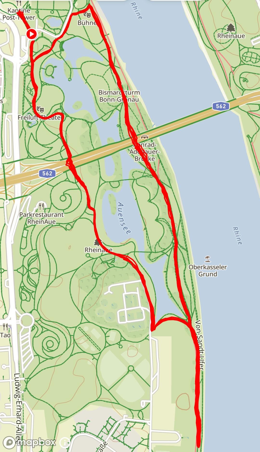 | Auf der gegenüberliegenden, der Beueler Seite grüßen im sog. Bonner Bogen das architektonisch ungewöhnliche Kameha-Hotel sowie die Rohmühle, ein ehem. Zementwerk. Auf dessen großer Freiterrasse kann man es sich u.a. sonntags beim Brunch mit Rheinblick gutgehen lassen. Über den Heimkehrerweg (!) geht’s wieder unter der Südbrücke hindurch, links steht fast majestätisch das Bismarckdenkmal mit dem Reichsadler und dem Familienwappen derer von und zu. Über einen Kiesweg führt der weitere Weg, links ist der Bereich des sog. Bonner Kunstrasens, wo regelmäßig Veranstaltungen stattfinden. Wehmütig denke ich an die Scorpions auf ihrer Crazy World-Tour zurück. Bevor wir ins ehemalige Regierungsviertel mit dem Abgeordnetenhochhaus Langer Eugen kommen, biegen wir links ab und sind über eine Baustelle bald wieder auf der Startgeraden. Unmittelbar vor dem Posttower erfolgt die zweite Wende und vorbei am Moderator laufe ich durchs Zeitmeßtor.