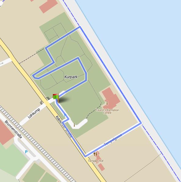 |  | Nach guten hundert Metern biegen wir am historischen Templerhof von 1657 (Vorgängerbau bereits 1215 dokumentiert) links ab und verlieren einige wenige Höhenmeter auf dem Weg zum Rheinufer. Wiederum links abbiegend folgen wir dem abgesperrten Fuß- und Radweg für etwa 300 m, um die verlorenen Höhenmeter beim Abbiegen links in den Kurpark wieder zu gewinnen. Ein paar Wege kreuz und quer durch den Kurpark später sind wir erneut an Start und Ziel und beginnen das Laufvergnügen von vorne. Ungewohnt ist das fast ausschließliche überholt werden durch die natürlich schnelleren Staffeln. Das macht aber gar nichts, denn wir wissen ja, wo wir, Christian und ich,  hingehören. Schön gemeinschaftlich drehen wir Schulter an Schulter unsere Runden, bis uns erstmals der Durst packt. Für die gerade nicht laufenden Staffelläufer optimal plaziert, steht kurz hinter dem Start-/Zielbogen ein kleiner Pavillon, an dem Wasser & Co. ausgegeben werden. Für uns ist es natürlich ungünstig, wenn wir uns erstmal durch die Reihen der Wartenden kämpfen müssen, um dann festzustellen, daß die ausgebende Dame mit dem Einschenken nicht nachkommt und wir unverrichteter Dinge wieder abziehen müssen, um nicht zu viel Zeit zu verlieren. Nach zwei vergeblichen Versuchen klauen wir beim dritten Mal einem wartenden jungen Mann seine beiden Becher vor der Nase weg und ergreifen das Hasenpanier, bevor er sich wehren kann.