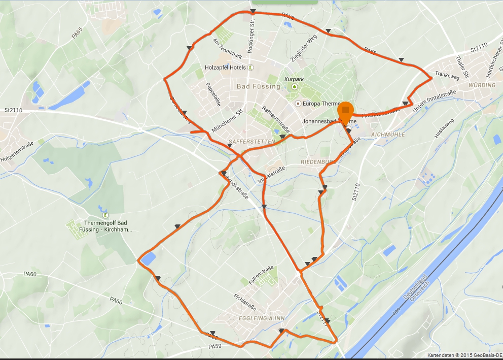 |  | Das Dorfzentrum ist bald durchmessen und es folgt jede Menge Natur, erfreulicherweise noch von jeder Menge Halbmarathonern bevölkert, aber das Ende dieser Begleitung ist abzusehen. Es folgt an einer Straßenkreuzung ein Kapellchen, an dem wir früher rechts in Richtung Golfplatz abgebogen sind, offensichtlich sollen wir diese Extremsportler aber nicht mehr durch unsere geschmeidigen Bewegungen stören und halten uns links. Ohne daß wir es merken, denn wir sehen das Wasser nicht, laufen wir bis unmittelbar an die Staatsgrenze, schlappe zweihundert Meter trennen uns noch von den Ösis. Und damit die Situation nicht zu bedrohlich wird, laufen wir ganz schnell wieder in Richtung Sicherheit, also weg vom Inn. Schon ist der Leiterwagen wieder da und der letzte Abschnitt des zweiten Viertels ist identisch mit dem des ersten. Alles wie gehabt: Therme, Artur, Tee/Wasser, Kreisel, rechts ab, die zweite. |  |  |