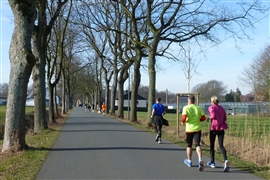 Knall, Bumm, geht es pünktlich um 10:30 Uhr los, und relativ wenige Marathoner machen sich auf die Beine. Lediglich 62 Finisher weist die Ergebnisliste aus, womit der Veranstalter nicht zufrieden sein kann. Bessere Bedingungen als heute kann man sich für Mitte Februar nicht vorstellen. 1.009 Erfolgreiche über alle acht Disziplinen weist die Ergebnisliste aus, das waren schon deutlich mehr gewesen, schade. Zunächst durch ein paar Anliegerstraßen mit netteren und nicht ganz so netten (rußgeschwärzten?) Einfamilienhäusern und unter einer Eisenbahnlinie lassen wir Bertlich bald hinter uns und kommen durch eine wunderschöne Allee mit hohen Bäumen, die sich scharf gegen den fast stahlblauen Himmel abheben. Im September spenden die bestimmt willkommenen Schatten und sind optisch noch ansprechender. Auf freies Feld abgebogen, ist der erste km des dreimal zu nehmenden 13,9 km-Kurses schnell erreicht.