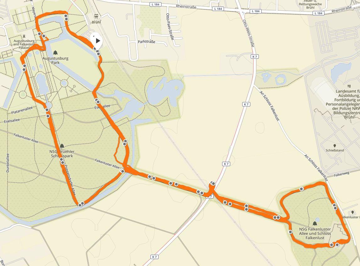Brühl hat also ein Schloß. Es ist einfach nur peinlich, denn das war mir völlig unbekannt. Und die Peinlichkeit nimmt noch gewaltig zu, als mir klar wird, daß es sogar zwei Schlösser mit einem offensichtlich ganz besonderen Park sind, die über ihre bloße Existenz hinaus seit 1984 den Status einer UNESCO-Welterbestätte genießen. Nun denn, genießen finden wir – das sind heute Hanne und ich - prima, daher finden wir uns nach einer einstündigen Anfahrt um kurz vor 9 Uhr auf dem kostenpflichtigen Parkplatz ein, von dem wir im Uhrzeigersinn gleich die erste der acht flachen 5,4 km-Runden in Angriff nehmen. Und zwar gemeinsam mit Ralf, der, wie bestellt, um Punkt 9 Uhr von seiner zweiten Runde zurückgekommen ist. Da er sich nicht traut, die Strecke in der Welterbestätte zu markieren und wir es mit der Bewegung nach GPS (noch) nicht so haben, ist uns das “betreute Laufen” wichtig.