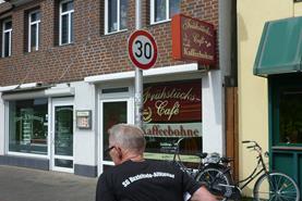 Dieser gebührt besondere Erwähnung, weil es sich bei ihr ganz offenkundig um die ehemalige Haupteinkaufsstraße handelt, bevor ihr unweit des Kaemmererplatzes die großen Filialisten Rang und Kaufkraft abliefen. Überall in Germanien also das gleiche Bild: Was der Internethandel nicht schafft, machen die Großen nieder. Die Folge sind auch hier bejammernswerte Leerstände und kaum noch vernünftige Läden. Dem Charme der Straße mit ihren zum großen Teil sehr attraktiven Gebäuden tut dies jedoch keinen Abbruch. Vor der Kaffeerösterei ist beidseitig ein großer VP aufgebaut, den zum jetzigen frühen Zeitpunkt wohl noch keiner in Anspruch nimmt und deshalb zunächst vergeblich auf Kundschaft wartet. Exakt auf Höhe der Bäckerei Itjen, die uns heute früh mit den notwendigen Kohlehydraten versorgt hat, ist der erste km abgearbeitet. Weiter führt der Weg vorbei an der katholischen Herz-Jesu-Kirche. Ein Schwenker nach rechts, schon sehen wir den Deich grün zwischen Bäumen und Häusern hindurchschimmern.