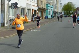 Wieder in der Schillerstraße überzeugt ein vollbesetzter Balkon durch seine Botschaft. „Wer wird Deutscher Meister?“ ruft ein peinlicher Läufer von unten. „Nur der BVB!“ schallt die frohe Botschaft wie erwünscht herunter. Geht doch. Auch wenn unser Klaus bekanntermaßen eine andere Meinung vertreten wird... Ich freue mich, Falko zu treffen, der bisher alle Ausgaben mitgemacht hat, derzeit ein ganz tiefes Tal durchschreitet und wenigstens den Halben erfolgreich nach Hause bringen wird. Vor der Kugelbake ist jede Menge los, Kitesurfer, so weit das Auge reicht. Zu Beginn der vierten Runde ist dann im Start- und Zielbereich schon weniger los und die Moderatoren können sich mehr den letzten Marathonern widmen. Für mich ein Grund, sie abzuklatschen und für die Anfeuerung zu bedanken, natürlich nicht ohne Foto. „Du bist ja geil!“, schallt's mir entgegen. Dem ist natürlich wenig hinzuzufügen, so starte ich beschwingt in die letzte Runde. Benjamin, als M30er in 3:27 Std. 19. im Ziel, läuft im BVB-Trikot. Die Abfolge von vorhin in der Schillerstraße wiederholt sich und beiderseitig grinsend trennen sich unsere Wege direkt wieder. Der stets gut gelaunte Ashley, passend zu Charles' Inthronisation mit Krönchen unterwegs, wird Benjamin noch kassieren. Macarena am Verpflegungsstand, gute Laune überall.
