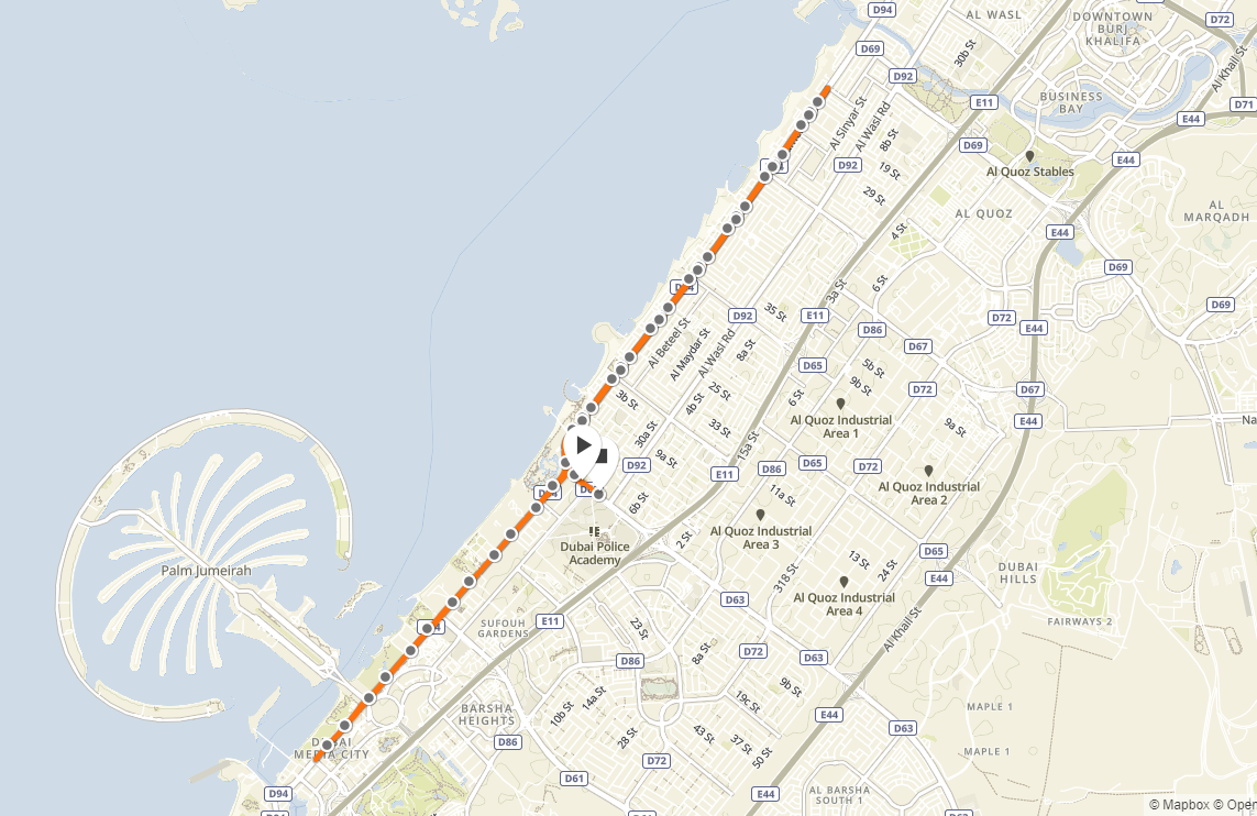 |  | Kaum auf die am heutigen arbeitsfreien Tag komplett gesperrte King Salman Bin Abdulaziz Al Saud Street (König Saudi Arabiens) eingedreht, kann ich frei laufen. Kein Kunststück bei mindestens drei (anfangs fünf) Autospuren in jede Richtung, hier finde ich schnell meinen Rhythmus. Schön ist der Anblick der aus dem Dunst auftauchenden Hochhäuser von Dubai Internet City vor uns sowie der Palmenreihen zu beiden Straßenseiten. Schon sind wir auf Höhe der berühmten Jumeira Palmeninsel, die man allerdings von hier leider nicht bewundern kann; das traumhafte Abbild hat aber wohl jeder schon auf Fotos gesehen. Dieses aberwitzig teure Objekt ist mittlerweile fertiggestellt, die Häuser und Wohnungen zu astronomischen Preisen verkauft. Ein großes Problem stellen Umweltschäden aufgrund des mangelnden Wasseraustauschs dar, denen man mit allerlei Tricks zu begegnen versucht.