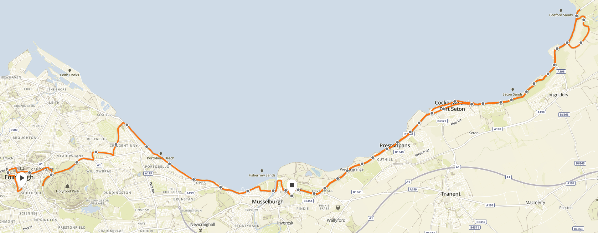 |  | Wunderbar zum Anschauen, aber wohl (zumindest jetzt) weniger zum Baden geeignet, ist der zwei Meilen lange Portobello Beach, dem wir hinter einem der zahlreichen Golfplätze komplett folgen. Allerdings ist die Optik aufgrund der ungünstigen Witterung doch etwas getrübt. Zudem genießen wir fast bis Meile 18 abwechselnd auflandigen Seiten- bzw. Gegenwind, der aber nicht wirklich behindert. Der Badeort Portobello, zu dem der Strand gehört, mutet sprachlich italienisch an, und tatsächlich existiert er schon seit der Römerzeit. Bodotria hieß er damals. Immer wieder erfreuen uns begeisterte Zuschauergruppen, die mit Beifall nicht geizen. Insbesondere einige Hilfsorganisationen, für die viele Einheimische Spenden sammeln (das ist in GB en vogue), stehen häufig am Rand und machen Alarm. Und auch zahlreiche Anwohner, die vor ihre Häuser Lautsprecheranlagen nach draußen gebracht haben und bei zünftiger Musik vor allem Weingummi anbieten.