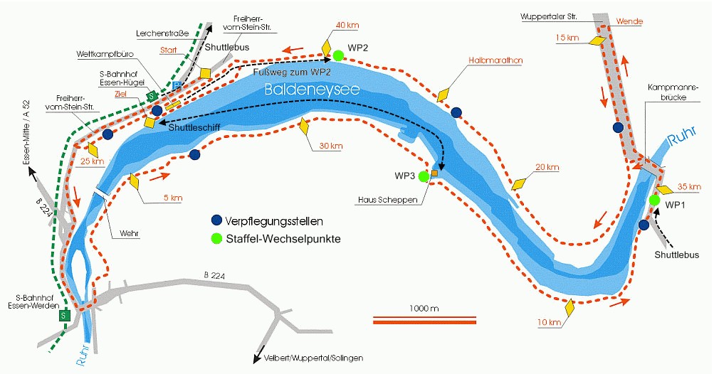 |  | Und Heinrich Kuhaupt, das Schlachtroß unter den Organisatoren aus Bad Arolsen, dürfte auch zufrieden sein. Denn hier gibt es kein Nebeneinander vielerlei Wettbewerbe unter dem Deckmantel des Marathons (wobei den dann vielleicht weniger als 10 % aller Teilnehmer laufen). Et jibt Marathon und feddich. Als einzige Konzession an Nichtmarathonfähige oder –willige ist zusätzlich ein Staffellauf mit bis zu vier Teilnehmern im Angebot. Mit dabei ist wie im Vorjahr erneut eine Prominenten-Staffel, die für die Aktion „Lichtblicke“ läuft. Damit werden in Nordrhein-Westfalen seit 1998 in materielle oder seelische Not geratene Kinder und Jugendliche sowie deren Familien unterstützt.  Als Nicht-Ruhrpöttler staune ich am Ort des Geschehens: Natürlich hat man schon mal gehört, daß die Luft deutlich besser geworden ist, seitdem die meisten Zechen geschlossen sind. Aber daß es auch so schöne grüne Ecken mit lauschigem Wasser gibt, ist schon eine feine Sache. Von wegen Pütt. Urlaubsatmosphäre nenne ich das und die will ich heute mit Jochen, dem gemeinsam mit mir angereisten Ultraläufer aus dem Wiedtal (der heute früh bei ganzen zwei Grad auf dem Fahrrad zu mir kam), genießen. Daniel Steiner steht auch in der Startaufstellung auf der breiten Freiherr-vom-Stein-Straße, allerdings als zwanzig Jahre jüngere germanische Ausgabe aus Essen. Lauffreund Peer, der in Köln mit noch nicht einmal 30 Jahren seinen 100. Marathon (und länger) lief und damit in den erlauchten Kreis aufstieg, glänzt durch Anwesenheit und wird mich über lange Abschnitte begleiten und unterhalten. Sogar ein Renault wird heute auf der Strecke sein. Nein, keine Angst, niemand wird umgefahren. Es ist genauer gesagt ein britischer Renault. Und zu Fuß unterwegs. Hä? Es handelt sich hier um einen der Favoriten, Neil Renault, von Midlothian aus Edinburgh/Schottland. Gab’s da nicht mal eine Fußballmannschaft? Heart of Midlothian? Tatsächlich wird er das heutige Rennen auch gewinnen. Die Formel 1 läßt grüßen. Ruckzuck geht es pünktlich los und wo so viel Platz zur Verfügung steht, ist auch der Letzte nach wohl kaum drei Minuten auf der Piste. Nach Westen, also entgegen dem Uhrzeigersinn, kommen wir auf der breiten Straße, leicht hinauf, direkt ins Rollen. Es ist noch recht frisch auf den ersten Metern, Jochen und ich hatten sogar die letzten Minuten, weil ganz in „kurz“, zum Aufwärmen in der Halle verbracht.  Der 3. km wird dann sonnig und führt uns über die Ruhrbrücke nach Werden. Nach links laufen wir zunächst einige Straßen ab, genießen die erste Trommlergruppe und den Beifall einiger Zuschauergruppen. Weiter geht es bald am Südufer des Sees, den man sich übrigens gut als nach oben gebogene, quer liegende Banane vorstellen kann, weiter in Richtung Neukircher Schleuse. Diese wurde Ende des 18. Jahrhunderts erbaut, um die Ruhr zu stauen, wird heute aber nicht mehr benötigt und steht unter Denkmalschutz. Wenig später passieren wir ein vom Reichsarbeitsdienst in den 30er Jahren des vergangenen Jahrhunderts gebautes Wasserkraftwerk, das heute noch rund 8.000 Haushalte mit umweltfreundlich erzeugtem Strom versorgt. Rechterhand stehen einige große Gebäude, denen man wohl in jüngster Zeit Balkone angebaut hat, die einen schönen Blick aufs Wasser erlauben. Über die nächsten km ist der Uferweg wieder recht schattig, die Sonne erreicht uns wegen des hohen Baumbewuchses kaum. Allerdings ist das wenig dramatisch, da inzwischen wohl alle auf Temperatur gekommen sein sollten, ich jedenfalls öle schon ganz ordentlich. Wir blicken über den See auf das Start-/Zielgelände mit Regattatribüne und Bootshäusern. Ein paar Cafés und Imbißbuden auf unserer (Süd-)Seite haben bereits geöffnet; einige Gäste genießen den Tag deutlich weniger angestrengt als wir, entschädigen uns aber mit aufmunterndem Applaus. Bier bekommen wir keines angeboten, aber es ist ja auch noch früh am Tag. Mal schauen, ob auf der zweiten Runde etwas gehen wird. Das interessiert mich auch in Bezug auf meine heutige Leistungsfähigkeit. Der zweite Marathon innerhalb von 8 Tagen vor drei Wochen in Karlsruhe hat mich merklich  Substanz gekostet; offensichtlich bin ich keiner, der ohne weiteres jede Woche einen Marathon verträgt, jedenfalls habe ich seitdem irgendwie müde Beine. Ich will heute versuchen, mit einem guten Gefühl knapp unter den vier Stunden zu bleiben. Sollte mir das nicht gelingen oder nur mit unverhältnismäßig hohem physischen Einsatz, werde ich ernsthaft über eine ein- oder zweiwöchige Laufpause nachdenken müssen. |