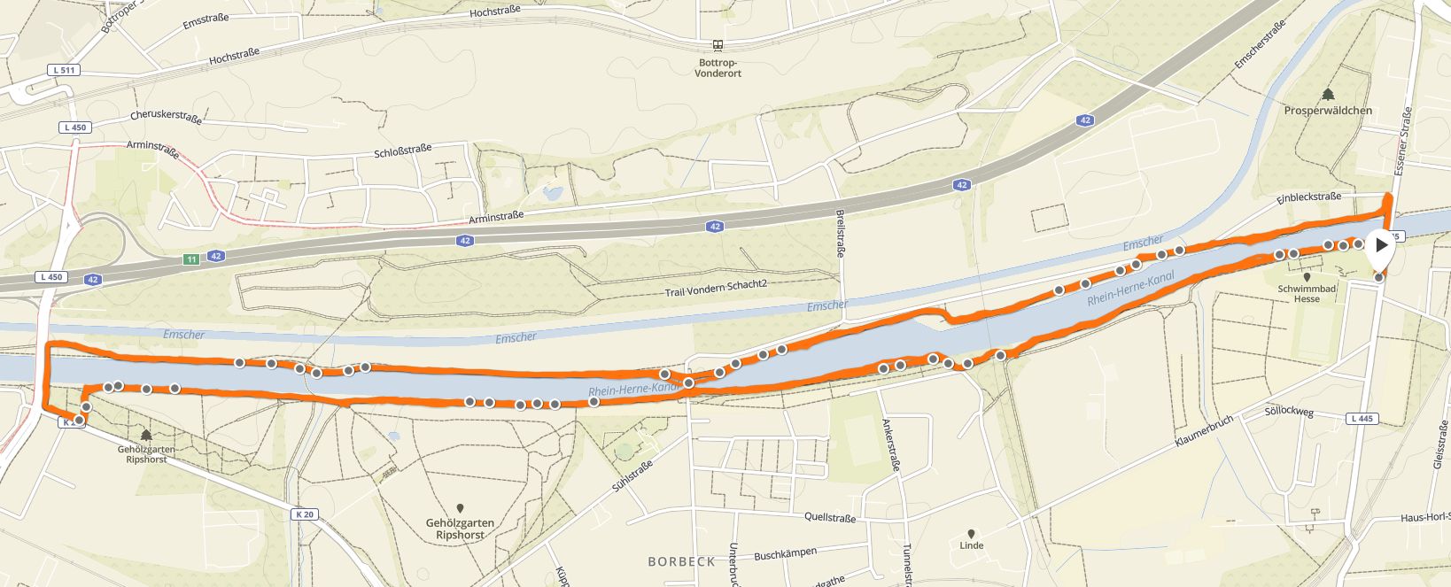 Wo Ihr gerade Emscher sagt: Die fließt auf dem Hinweg rechts von uns und war einmal die Kloake des Ruhrgebiets, weil man eine Verrohrung der Abwässer aus bergbautechnischen Gründen verworfen hatte. Wirklich renaturiert wirkt sie zumindest hier noch nicht, aber wie ein großer Abfluß sieht sie auch nicht gerade aus. Das wird schon was werden. Toll fand ich seinerzeit auch schon den Baldeneysee, den ich am 10.10.10 ab 10.10 Uhr zweimal umkurvt habe. Jetzt drehen wir aber erstmal hier unsere zweite Runde.