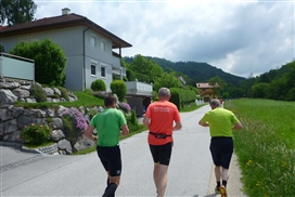 Um Punkt 11 Uhr geht es unter dem Beifall des überschaubaren Publikums los. Elke schaut ein wenig bedröppelt drein, denn sie muß vier Stunden auf ihren Start warten und weiß nicht so richtig, wie sie die Zeit herumbringen soll. Durch das Zelt der späteren Zielverpflegung laufen wir zum Ende der Hauptstraße und nach kurzer Zeit aus Kirchdorf heraus nach Hausmanning. Daß die Strecke direkt so ordentlich ansteigt, hatte ich nicht erwartet, obwohl ich natürlich im Vorfeld alle verfügbaren Laufberichte studiert hatte. Auf dem Höhenprofil sah's jedenfalls nach weniger aus. Und es kommt direkt ordentlich: Zwischen knapp km 1 und gut km 2 nehmen wir direkt die ersten rund 100 Höhenmeter. Trotzdem funktioniert das Anlaufen gut. Not the distance, speed kills, wie der Lateiner zu sagen pflegt.