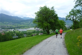 Ein Schild weist den folgenden Abschnitt als Panoramaweg aus, was einige wenige Minuten wirklich zutrifft: Der Blick ins Kremstal und auf den gegenüberliegenden Höhenrücken ist klasse, nachdem uns der Dauerregen der vergangenen beiden Tage rechtzeitig verlassen hat und auch der Dunst verschwunden ist. Bauernhof zur Linken, glückliche Hühner zur Rechten, so verlassen wir den Asphalt und biegen auf einen schönen, leider nur kurzen Waldpfad ein, dem sich ein feiner, allerdings sehr nasser Wiesenweg anschließt. Ich beglückwünsche mich jetzt schon zu meiner Entscheidung für GoreTex-Schuhe. Zum ersten Mal steht hier der Fotograf, der uns den ganzen Lauf begleiten wird, und dessen Produkte wir später kostenfrei von der Homepage der ausrichtenden LG Kirchdorf herunterladen dürfen. Ein feiner Zug von Euch!
