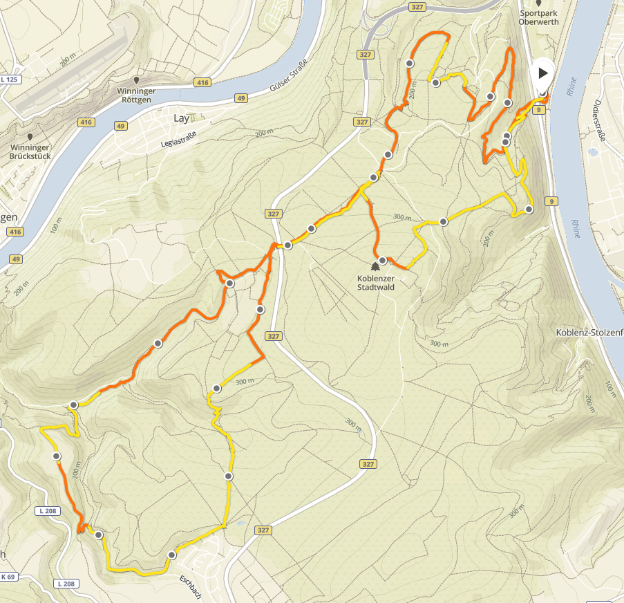 Der anspruchsvolle Rundkurs bewegt sich komplett im Koblenzer Stadtwald und beginnt und endet am Koblenzer Biergarten am Rheinufer. Zu bewältigen waren 23 km mit 825 Höhenmetern. Der Asphaltanteil liegt bei ca. 1 %.