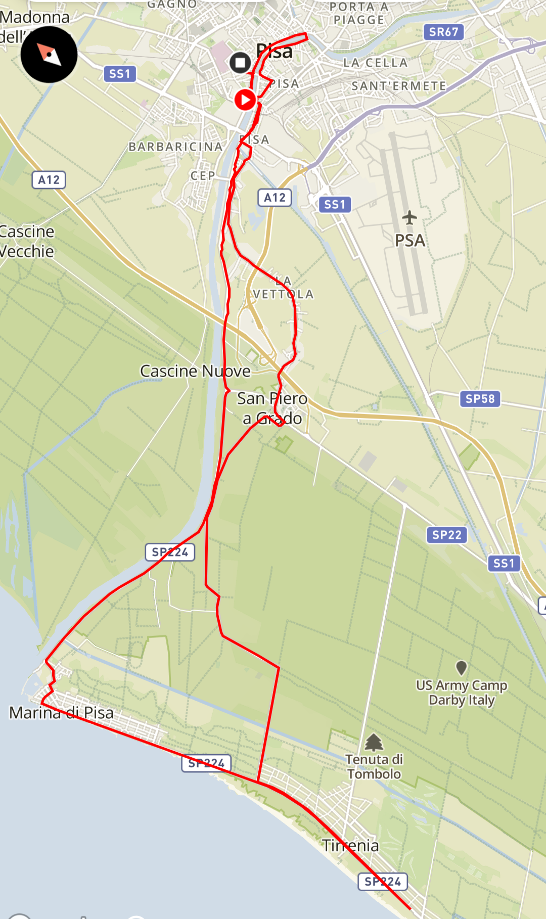 |  | An km 12 erfolgt die Streckenteilung der gemeinsam gestarteten Halb- und Marathonläufer. Letztere setzen ihren Weg fort, die Halben treten nach einem scharfen Knick über eine Parallelstraße den Weg zurück nach Pisa an. Ewig weit geht mein Blick auch hier nach vorne, gut, daß ich damit kein Problem habe. Auch nicht mit dem schon dritten VP, der das volle Programm aus warmem (!) Tee, Wasser, Orangen, Bananen, Zucker und Keksen bietet. Gleichermaßen Auge und Herz erfreut ein Pinienwäldchen, das uns für die nächste Zeit verschluckt, bevor wir einen größeren Militärkomplex streifen und nach einer weiteren langen Gerade den Badeort Tirrenia erreichen. Auch er gehört zur Stadt Pisa und wurde vom Duce gegründet. Viele Architekten aus ganz Italien bauten hier Waisenzentren und Häuser für Reiche. Ich bin weder das eine noch das andere, also weiter. Bald darauf erreichen wir unzweifelhaft das Meer, das wir aber noch nicht sehen können.