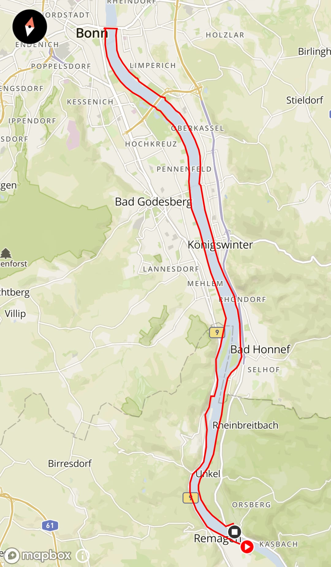 Laufen am Wasser ist bekanntermaßen exakt mein Ding, und wenn der Weg komplett am Naß vorbeiführt, gibt’s kein Halten mehr. Was steht also heute auf der Agenda? Ein Kurz-Ultra am Rhein. Von Remagen aus führt der Hinweg nach Bonn, auf der mittleren der drei Bonner Brücken wird der Rhein überquert und auf der Gegenseite bis Erpel zurückgelaufen. Am Ende sollen dann 45,1 km auf dem Tacho stehen. Eine Herausforderung stellt dabei natürlich die Verpflegung unterwegs dar, denn der berühmte Kofferraum steht an Start bzw. Ziel. Also muß alles Erforderliche mitgenommen bzw. an geeigneten Stellen gekauft werden. Ich gehe auf Nummer sicher, habe zweieinhalb Liter Getränke, ein Brötchen und einen dicken Riegel im diesmal recht schweren Rucksack dabei. Das sollte (und wird) reichen.