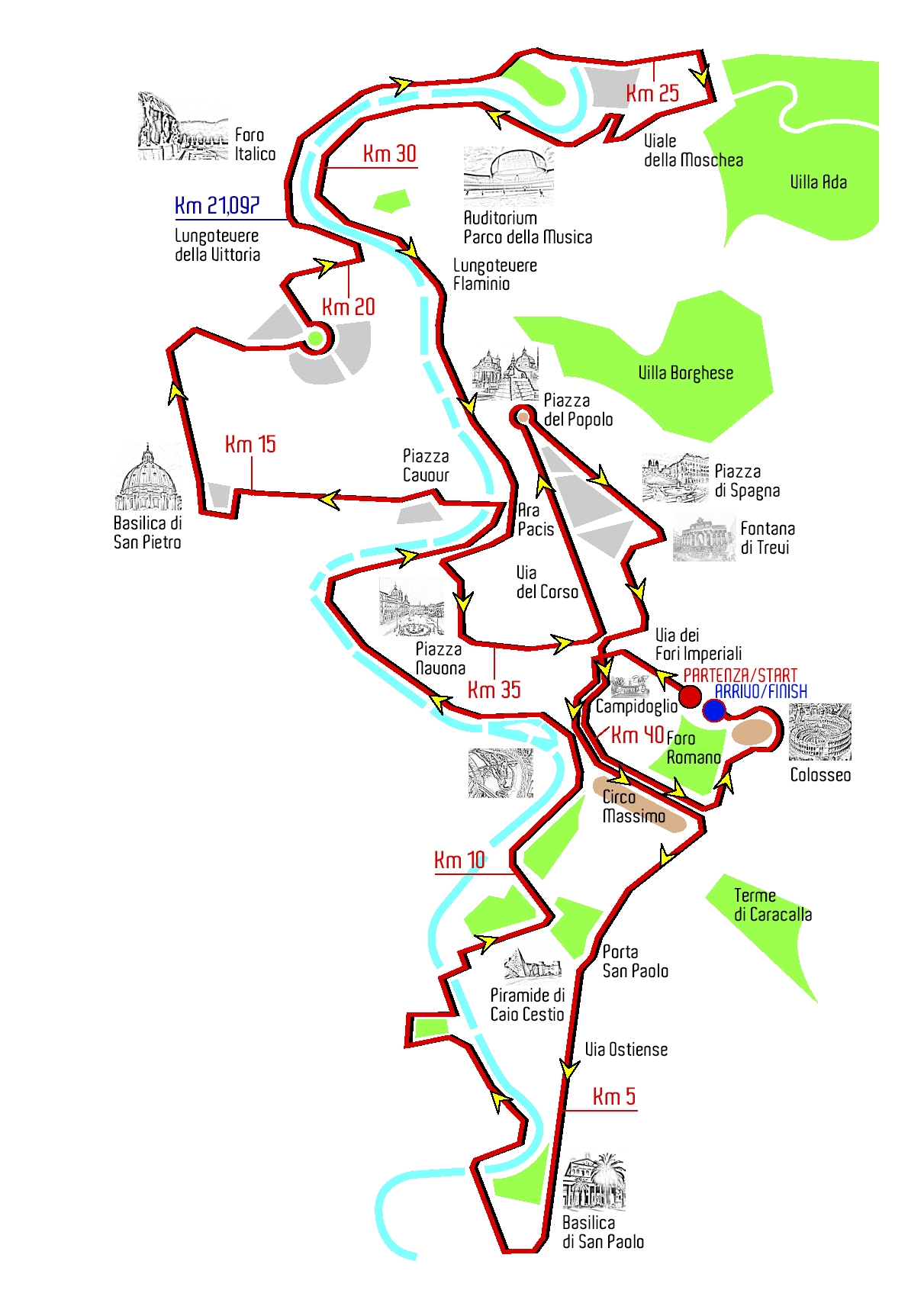 |  | Iucundi sunt acti labores! Nach getaner Arbeit fühlt man sich wohl! Wir machen noch bis Dienstagnachmittag die Stadt unsicher und fliegen von einem tollen Abenteuer wieder nach Hause. Zur Nachahmung empfohlen. Unterkunfts- und Restauranttips gebe ich gerne. Arrivederci Roma! Noch viel mehr Fotos bietet der gleichlautende Laufbericht auf marathon4you.de!   Streckenbeschreibung: Fast flacher, bestzeitfähiger, beeindruckender Einrundenkurs vorbei an allem, was in Rom Rang und Namen hat. Einige leichte Wellen und zwischen den Höhepunkten, insbesondere im Mittelteil, und auch einige optische „Durststrecken“. Aber wo ist das nicht so? Jeder km ist ausgeschildert. Viel Kopfsteinpflaster, viele Schlaglöcker, Aufpassen ist angesagt.