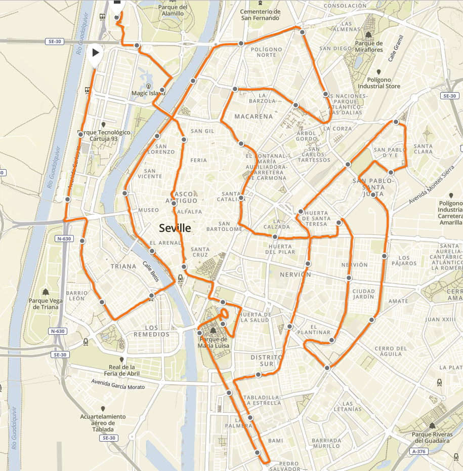 |  | Der Kurs durch den Stadtteil Macarena ist nicht unbedingt von optischen Leckerbissen verwöhnt, bis wir kurz vor km 15 direkt auf imposante Reste der ansonsten zugunsten der städtebaulichen Entwicklung abgerissenen alten römischen (!) Stadtmauer zulaufen. Nicht nur hier stehen überraschend viele Zuschauer. Ganz offensichtlich wird der Marathon von der Bevölkerung gut angenommen, entsprechend ist die akustische Unterstützung. Auch wird großflächig geworben, mindestens einen Straßenbahnzug hat man komplett beklebt. Das ist längst nicht überall so. Mittlerweile wird schon lange alle zweieinhalb km verpflegt und somit für mehr als ausreichend Hydrierung gesorgt. Übrigens sind die Tische (intelligenter als bei so manch einer anderen Veranstaltung) hintereinander auf beiden Seiten versetzt aufgebaut, sodaß es nie zu Staus kommt.  Schöne, alte Gebäude begleiten uns und auch der Herr Sohn steht wieder zuverlässig zum Jubeln hier. „Animo! Venga! Vamos! Campeones!“ schallt es von allen Seiten. Zwei kurze Reste des alten Aquaeduktes (Wasserleitung) bringen uns zum Bahnhof und damit auf die Avenida Kansas City. Kansas City? Da habe auch ich erst einmal gestaunt, weil ich nicht wußte, daß zwischen diesen beiden Kommunen schon seit guten 50 Jahren eine Städtepartnerschaft besteht. Unvermittelt ist km 20 erreicht und damit die maximale Strecke, die ich seit meinem letzten Marathon vor zwei Monaten gelaufen bin. Gute Vorbereitung sieht natürlich anders aus, daher muß ich darauf setzen, daß der Körper sich erfolgreich erinnert, mal besser drauf gewesen zu sein. Halbzeit.