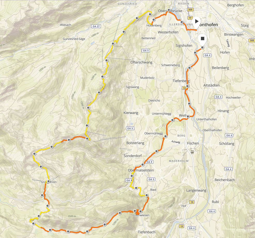 |  | Schnell haben wir zwei Straßen unter- sowie die Iller überquert und arbeiten uns die ersten Meter parallel dieses Flusses voran. Hinterm Sonthofener See geht’s scharf links ab in die Botanik. Die ersten Höhenmeter leiten uns von Sonthofen weg und im Umdrehen leuchten der Berg Grünten („Wächter des Allgäus“) und die Stadt im leichten Dunstschleier, der sich aber recht flott auflösen und viel Sonnenschein Platz machen wird. Für diejenigen, die diesen Bericht später lesen werden, sei gesagt, daß wir Riesenschwein mit dem Wetter haben. Gerade rechtzeitig hat uns die sibirische Kälte mit tagsüber bis zu schlappen acht Grad im Dauerregen verlassen, daher kann ich in „Kurz“ laufen. Die morgendlichen 14° werden im Tagesverlauf bis auf 24° steigen. Nicht wenige haben dem Wetter nicht getraut, sind viel zu warm angezogen und streifen die überflüssige Kleidung alsbald ab. Wohl dem, der für diesen Zweck einen Rucksack dabei hat (ansonsten benötigt man keinen). Asphalt wechselt zum Wiesentrail und zurück. Kaum daß ich knapp zweieinhalb km unterwegs bin, fordert der mir verbliebene Verstand Gehschritt ein, und so ist es. Kraft sparen heißt die Devise. Schon kommt der erste von ungezählten Verpflegungspunkten, er wird direkt zum Nachtanken genutzt. Auf Kies und Wiese geht es weiter stramm aufwärts, rasch gewinnen wir an Höhe und auch an Aussicht. Erstmals verschluckt uns Wald, ein schöner Wurzelweg wie Zuhause im rheinischen Westerwald erfreut meine Sinne, bald sind wir halb im Farn versteckt. Schon haben wir die ersten fünf km abgehakt, so kann es gerne weitergehen. Immer steiler wird der Weg, führt uns am Allgäuer Berghof weiter voran.