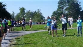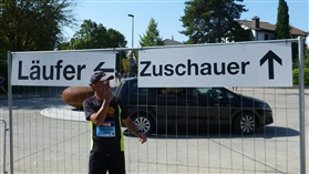 Der Start erfolgt in mehreren Wellen, die im Abstand von acht Minuten erfolgen. Wir haben uns für die dritte entschieden, die für eine Endzeit von ± 1:50 Std. geeignet ist. Genau das ist auch mein Ziel. Schon während der Startvorbereitungen in Uster (Start und Ziel) sucht jeder ein schattiges Plätzchen, denn 28 Grad in der reichlich vorhandenen Sonne versprechen einen heißen Tanz. Um 15:16 Uhr geht es dann auch pünktlich los und Eckbert ist bei ähnlichem Zeitziel sofort auf und über alle nicht vorhandenen Berge. Ich lasse ihn direkt ziehen, denn sein Tempo ist mir deutlich zu hoch. Im Schnitt eine km-Zeit von 5:10 min., das wäre es. Daß ich vor Jahren den Marathon schon unter 5 min/km gelaufen bin, ist inzwischen Kriegsgeschichte, altersgerechte Fortbewegung daher Trumpf.