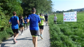 5 km sind nach 25:29 min. genommen, das sieht bisher sehr gut aus. Sehr gespannt bin ich, ob Eckbert das Tempo wird durchhalten können, gegönnt sei es ihm. Gemessen an seiner 1:46 ungerade beim Halbmarathon in Bonn ist das nicht unrealistisch. Etwa sechs km sind absolviert, als wir am Nordende des Sees einen U-Turn machen und auf der gegenüberliegenden Seite die Richtung wechseln. Nette Motivationsschilder lockern immer wieder auf und auch der Anblick der vor mir liegenden bunten Läuferschlange trägt zu meinem Wohlbefinden bei. Obwohl: Warm ist es schon, die Strecke verläuft fast ausschließlich ohne Schatten. Aber lieber so als im Dauerregen, keine Frage.