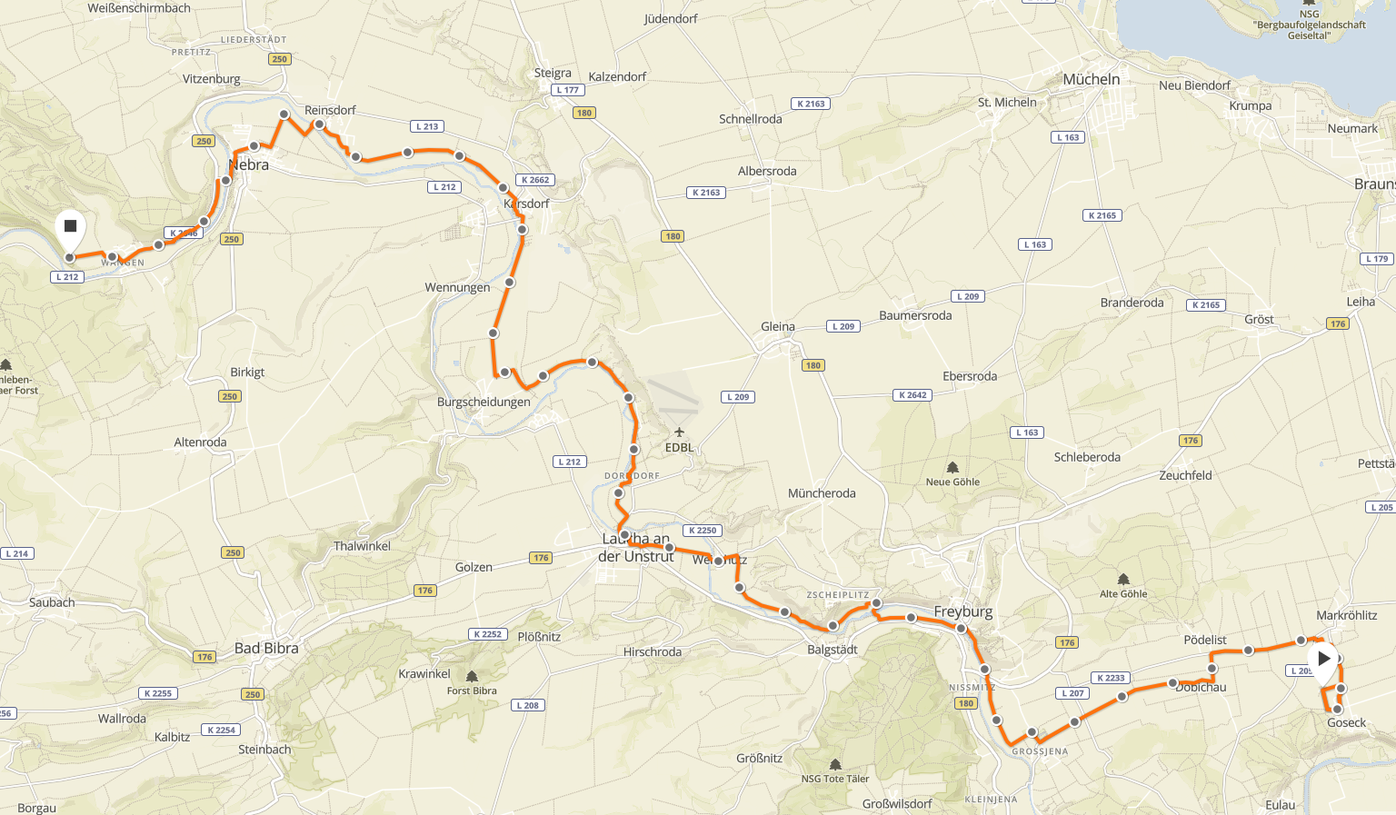 |  | Einfach nur schweißtreibend Schon die ersten Meter sind, obwohl die Sonne noch weitestgehend wolkenverhangen ist, durchaus schweißtreibend, was sich im weiteren Verlauf, dann ohne Wolken, noch deutlich verstärken wird. Auf gut zu belaufenden Straßen kommen wir zügig voran, schon streifen wir nach 3,5 km das zu Goseck gehörende Markröhlitz. Immer wieder werden wir auf unserem Weg nach Westen kleinere Ortschaften durchmessen und nicht nur dort die wirklich attraktive Landschaft kennenlernen. Aufgrund der als bekannt vorausgesetzten Geschichte unterscheiden sich die Dörfer wirklich immer noch teilweise von dem, was der Wessi von zuhause kennt, und das bald dreißig Jahre nach der Wiedervereinigung. Das besitzt aber für mich durchaus Charme. Weit können wir auf unserem Kurs vorausschauen, immer wieder prägen lange Geraden unseren Weg. Wohl dem, der darauf eingestellt und psychisch gefestigt ist. Das soll aber keineswegs bedeuten, daß es nichts zu sehen gäbe: Die stark landwirtschaftlich geprägte Gegend ist leicht wellig (175 Höhenmeter werde ich am Ende ermittelt haben) und ausgesprochen abwechslungsreich. Mir jedenfalls wird kein Meter langweilig. Auf dem Weg zum ersten VP kommen uns schon Radler entgegen. Wie auch beim heimischen Windhagen-Marathon hat man die Veranstaltung durch eine Radtour aufgewertet und sich so ein ansehnliches, weiteres Teilnehmerfeld erschließen können. Gute Idee, insbesondere auch deshalb, weil man die Radsportlegende Gustav Adolf „Täve“ Schur (den mitteldeutschen Rudi Altig) zum Mitmachen gewinnen konnte. Täve gehört übrigens dem Jahrgang 1931 an, ist demzufolge stolze 87 Jahre alt und ganz offensichtlich kerngesund!